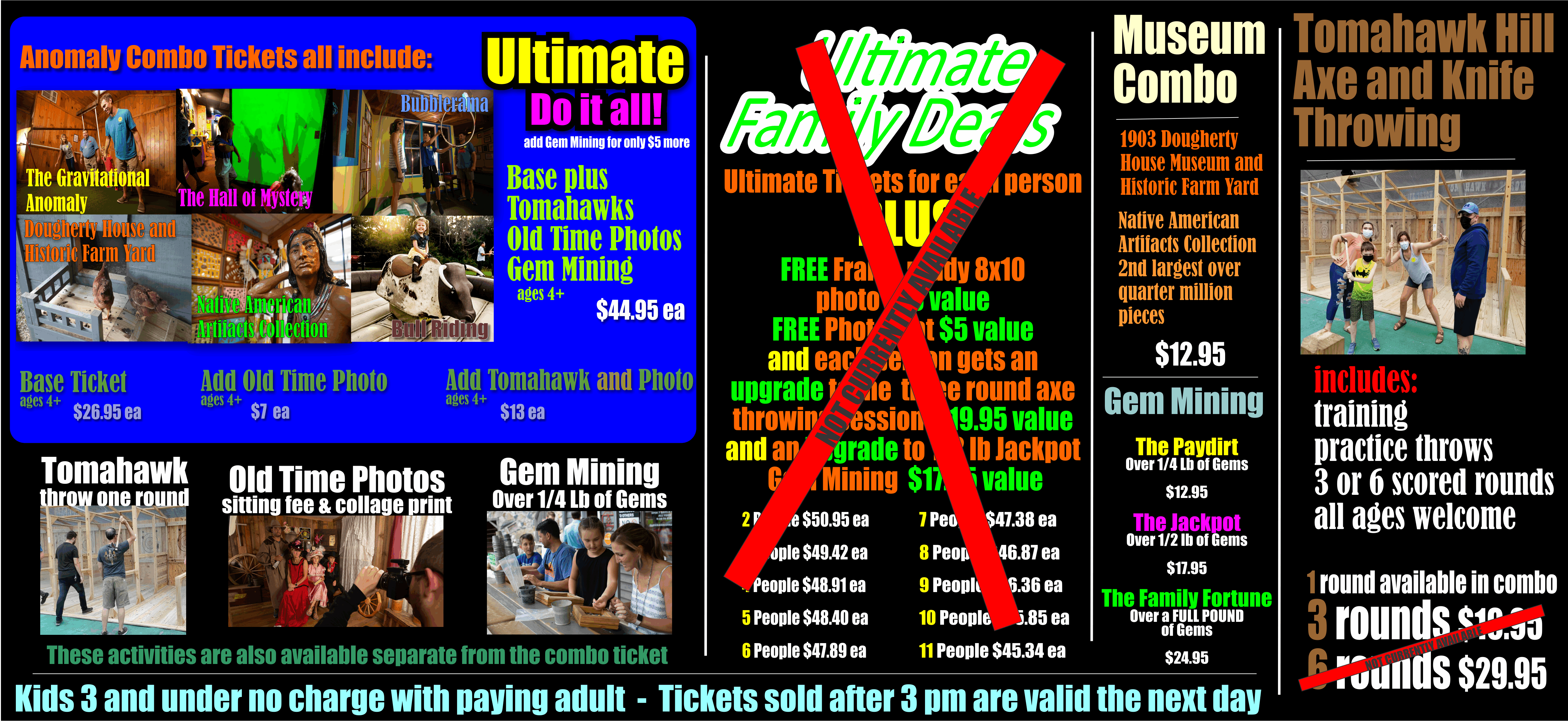 - Tickets sold after 3 pm and Ultimate tickets are valid the next day for attractions not completed the first day